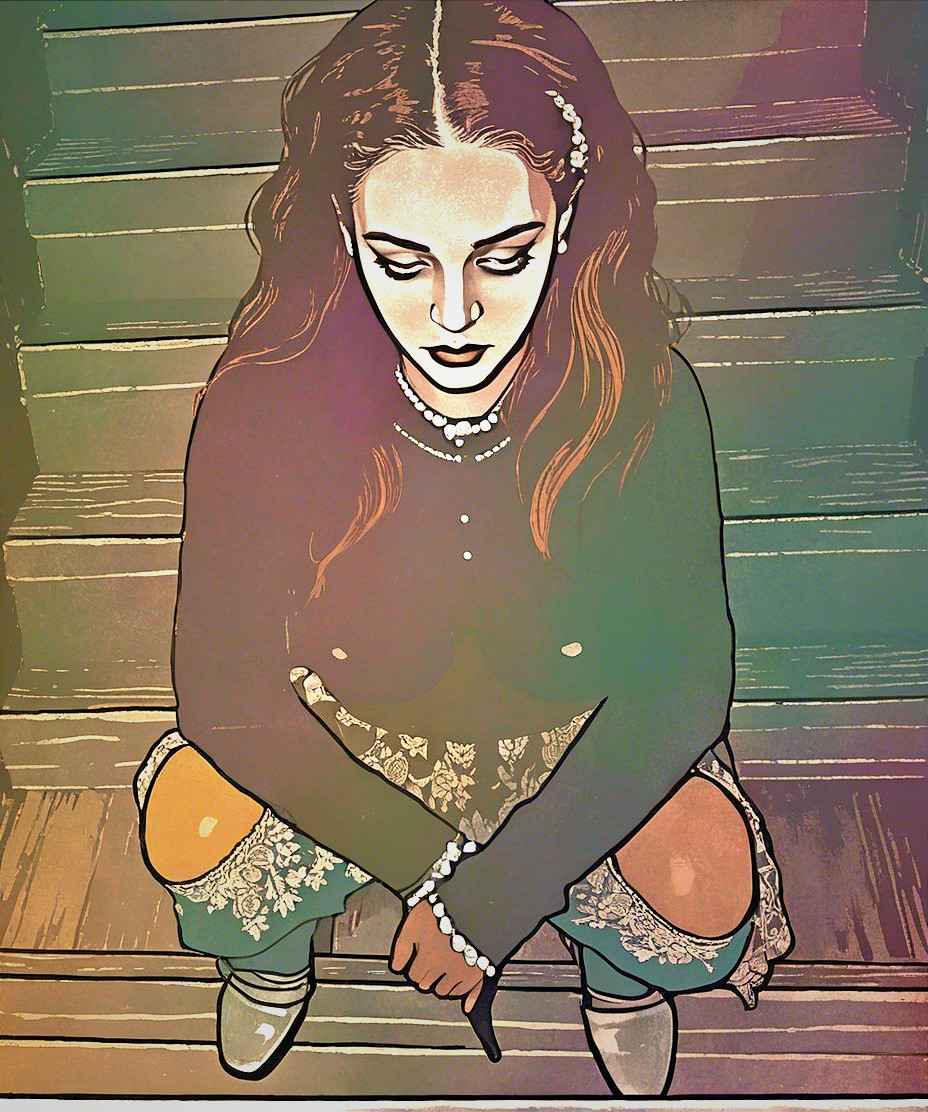 A stylized illustration of a young woman sitting on stairs, wearing a dark top, adorned with pearls, and a patterned skirt. Her expression is contemplative, with vibrant colors enhancing the scene.