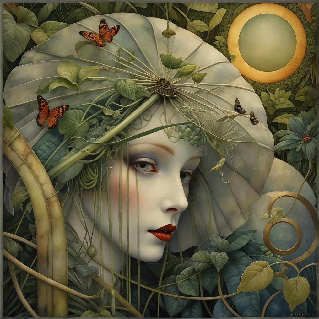 Close up, impish devious beautiful Pierrot creature in a garden jungle maze, in the style of Alexander Jansson. by Catrin Welz-Stein, Michael Parkes