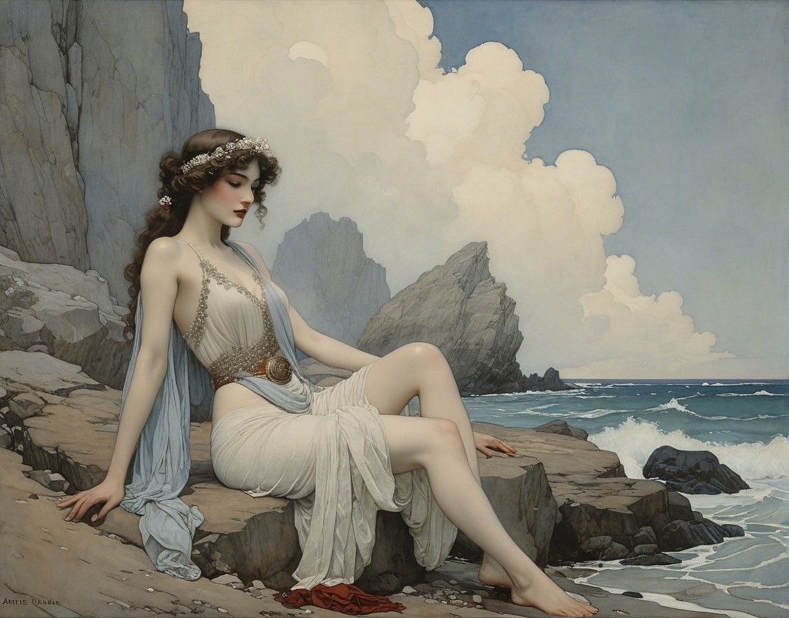 The image depicts a serene woman in a flowing dress, seated on a rocky shoreline. With soft waves and a cloudy sky, it evokes a dreamy, tranquil atmosphere. Floral accents adorn her hair.