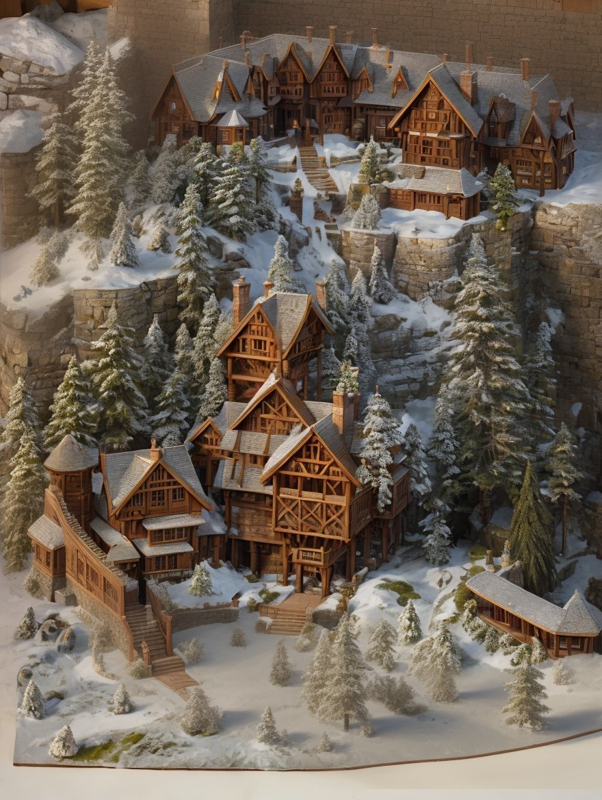 A detailed miniature model village featuring quaint wooden houses, snowy pine trees, and stone walls, evoking a medieval alpine setting.