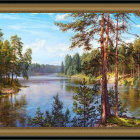 A serene landscape painting features a calm river bordered by tall trees and mountains in the background. Several raccoons explore the water, creating a peaceful natural scene.