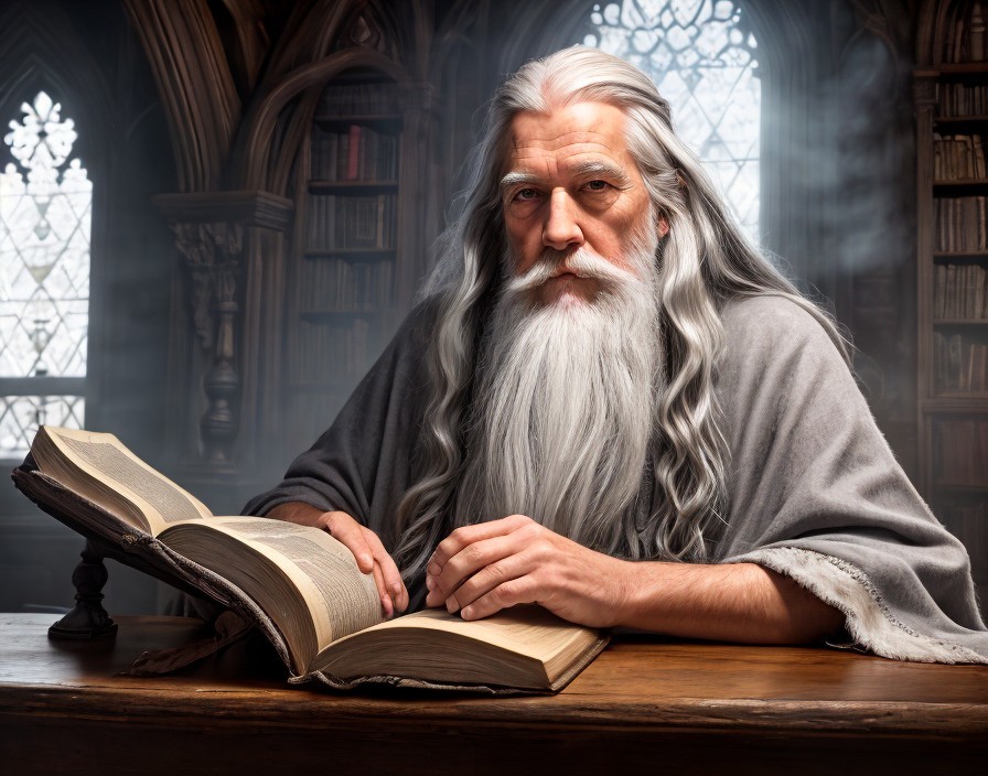 A wise, bearded wizard in robes reads an ancient book in a library with stained glass windows. The man is reminiscent of Gandalf and imparts a mystical, scholarly atmosphere on the viewer.