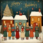 A cozy winter scene featuring a group of people caroling in front of colorful, snow-covered houses. The night sky sparkles with stars, and a festive wreath adorns the turquoise door.
