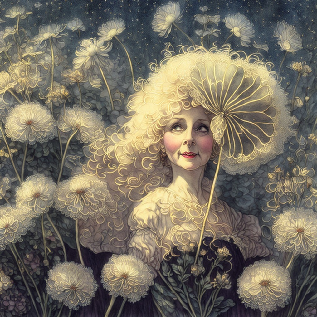 An elderly woman with curly white hair smiles warmly, surrounded by an abundance of soft, blooming flowers. Her gentle expression radiates joy and tranquility in a serene setting.