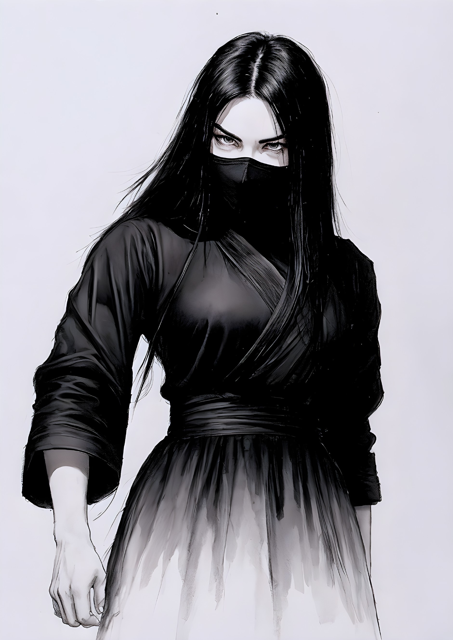 A hyperrealistic ink sketch of a fighting ninja with intense eyes, swift movements, and a determined expression. The artwork features a moonlit night, an ancient temple, and cinematic lighting, creating an elegant and intense atmosphere with a touch of horror.