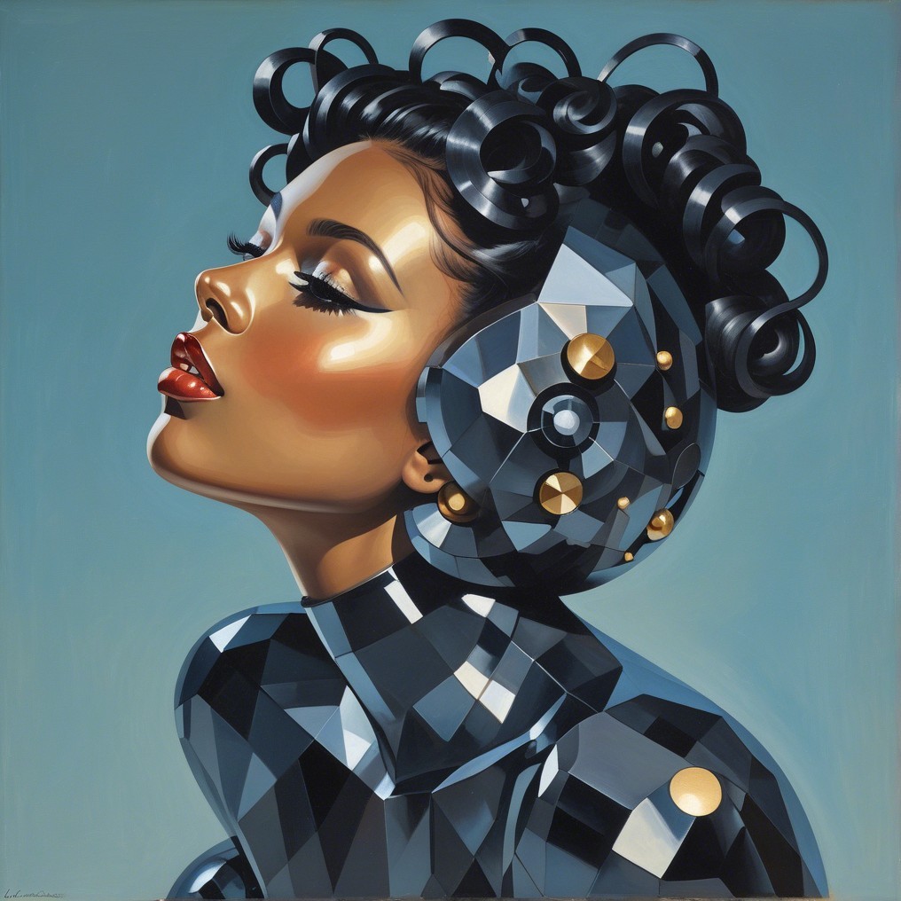 A striking figure in a sleek, black bodysuit adorned with bold gold accents. Her glamorous hairstyle complements the geometric background, blending elegance and modernity in an artistic fusion.