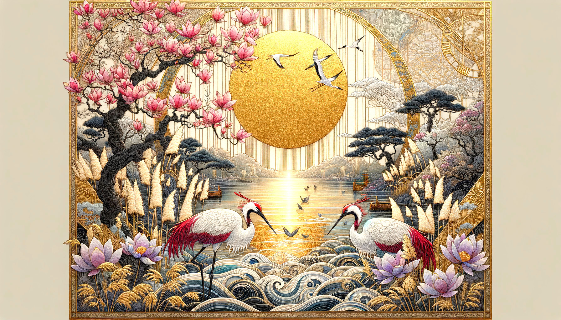 An ornate, gold-accented artwork featuring cranes, cherry blossoms, and a stylized sun over a serene waterscape.