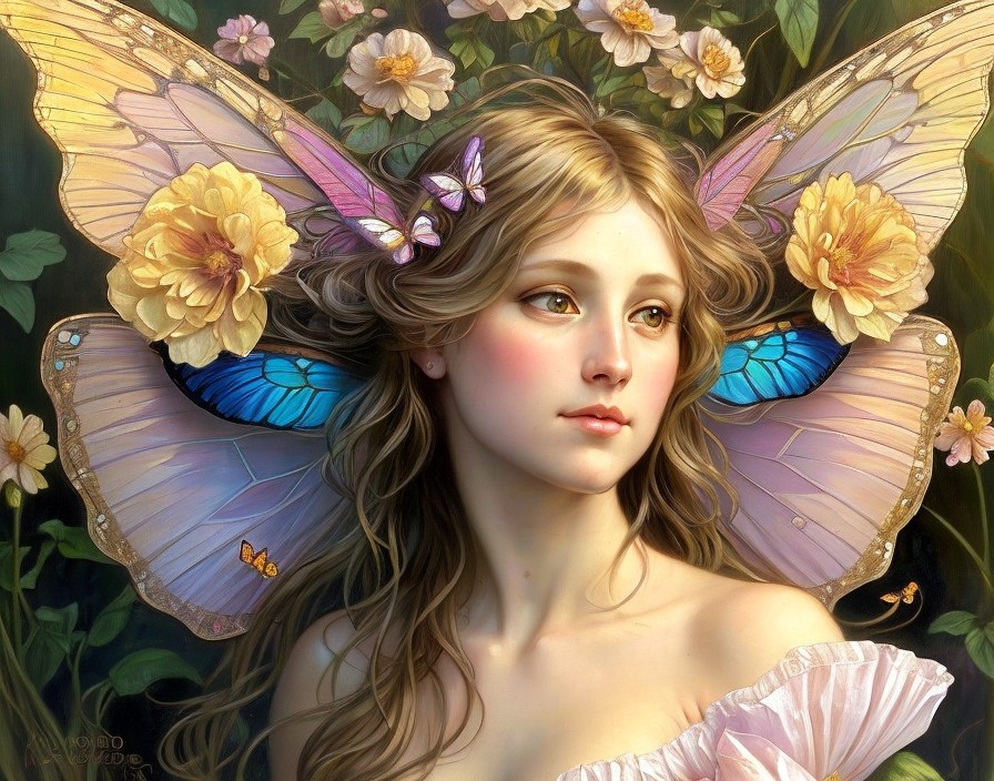 A serene fairy with butterfly wings in vibrant shades of blue and gold, surrounded by flowers. Her flowing hair is adorned with blossoms, capturing a magical and enchanting moment.