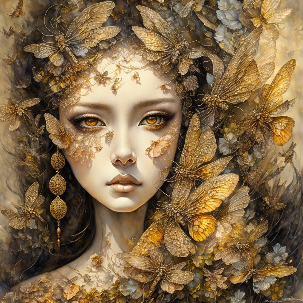 A digital artwork of a woman with gray hair adorned with leaves and butterflies, showcasing detailed features and a serene expression.