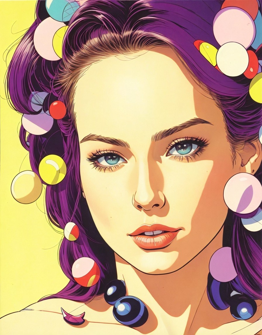 Marvel comic book art, 1990s animated female character, close-up, headshot, stacked-up perspective, line-art print, divisionism, colored line drawing, style is reminiscent of instaport art, bold lines and pastel colors, manga style heroine in style of Georgia O'Keefe and bob eggleton and Overton Loyd and Didier Lourenço, minimalism, synthetic, serene, Layered Artwork, american gothic 1.3, triadic color scheme purple beige ochre, Figurative, wet on wet painting details, pastel tones of lilac auburn beige, squiggly lines by Margaret Keane and Georgia O'keffee, Streamline_Moderne, anisotropic filtering 1.7, shadow mapping 1.3, wavery texture, complexion 1.2, radiance, bubbly brightness 1.3, zentangle method, abstract, brushstroke fields, grunge, auracore, cottagegore 1.7, blur, octane render illustration, uhd, hdr, anisotropic filtering 1.7, dynamic lighting 1.3, hysterical art, high coloring, golden ratio, divisionism, quilling, quaint, cel-shaded, somber, desaturated colors, soft rounded edges, back-lit,pop art essence, overall composition by, in the style of Surikov, Timlin, Lourenço, Steadman, Armstrong, Bryullov, Perov, Chevalier, volumetric texture patchwork