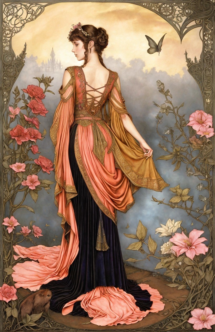 A graceful woman in an elegant, flowing gown stands by a serene lake, surrounded by blooming roses and fantastical towers in the background, evoking a dreamy, romantic atmosphere.