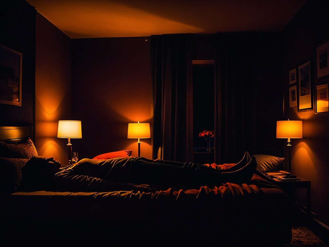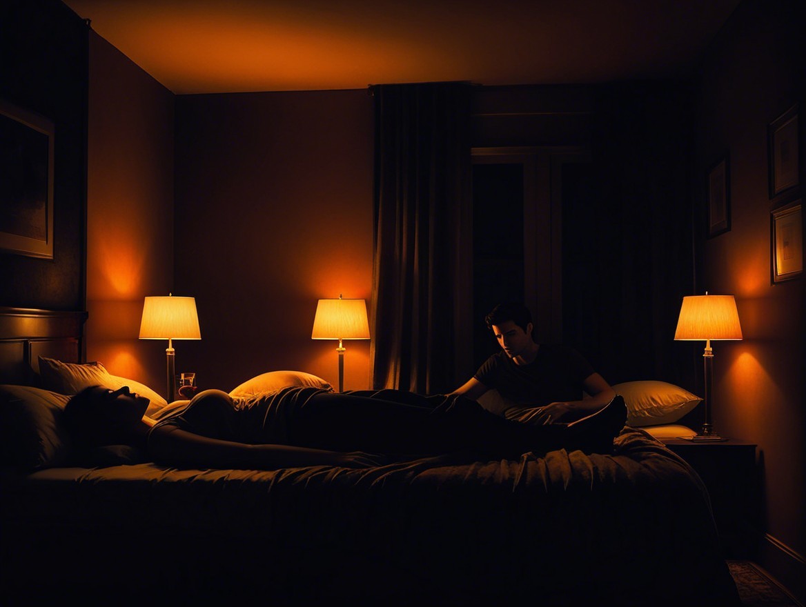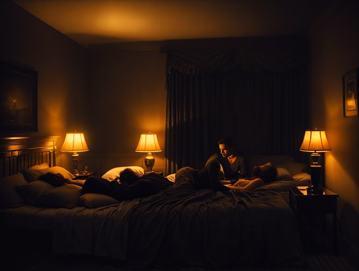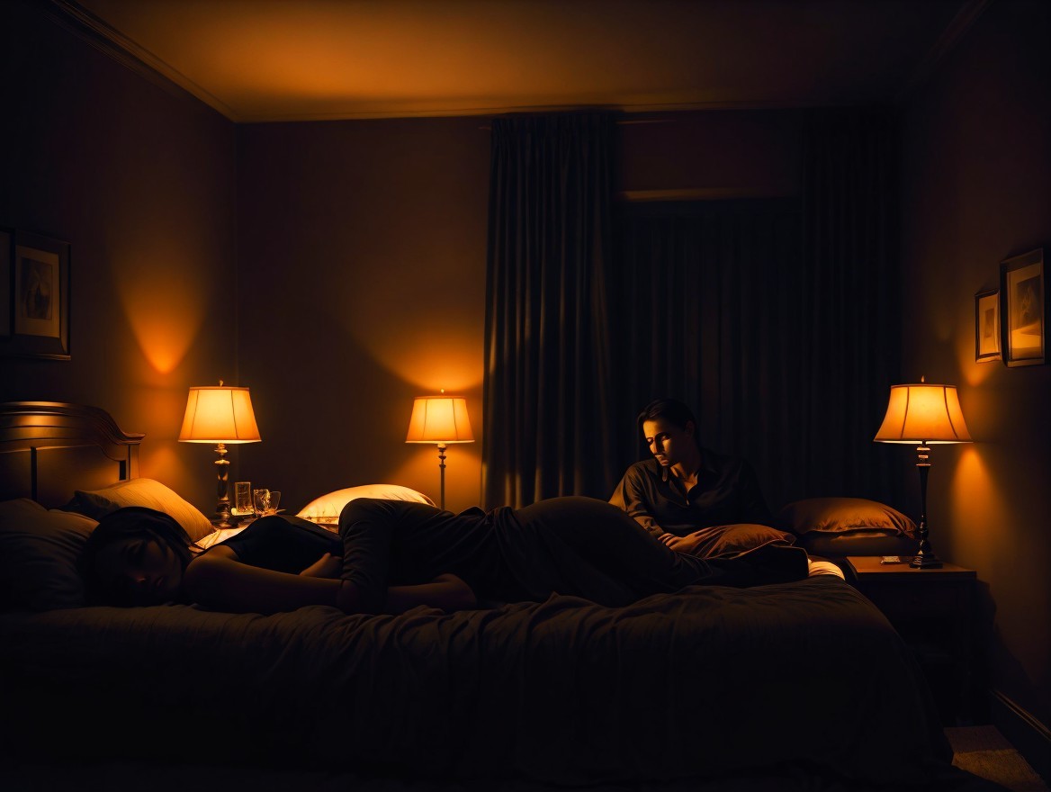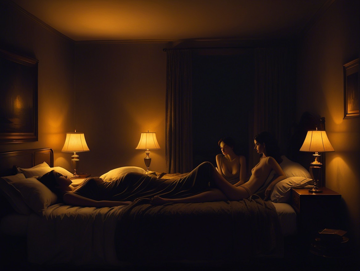 In a dimly lit bedroom, three women are positioned on a bed. Soft golden light from bedside lamps casts a serene atmosphere, highlighting their contemplative expressions and relaxed poses.