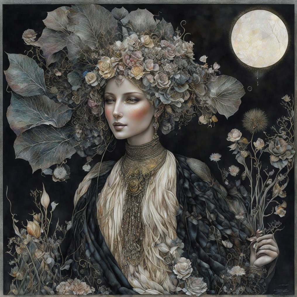 A serene woman with elaborate curls, adorned in intricate jewelry and a flowing gown. She's set against a dark backdrop with a luminous moon and floral elements, exuding elegance and mystery.