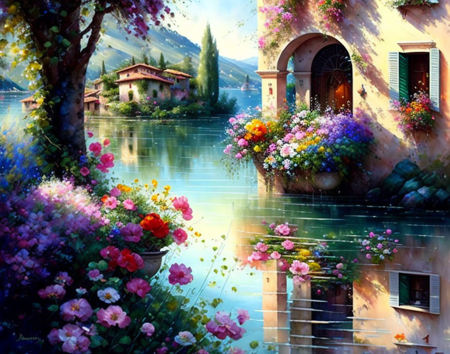 Prompt: "My dream home in a small Italian village with balconies, lots of flowers a beautiful garden and a good view over the lake. Wet on wet watercolor"