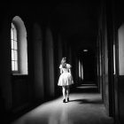 A monochrome image features a young man in a top hat and a tailored suit alongside a young woman in a white blouse with suspenders. They stand against a backdrop of industrial elements, creating a mysterious vibe.
