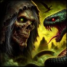 Two fearsome, monstrous creatures with reptilian features face each other, their glowing eyes intense. They have sharp teeth and formidable horns, surrounded by a dramatic, fiery landscape.