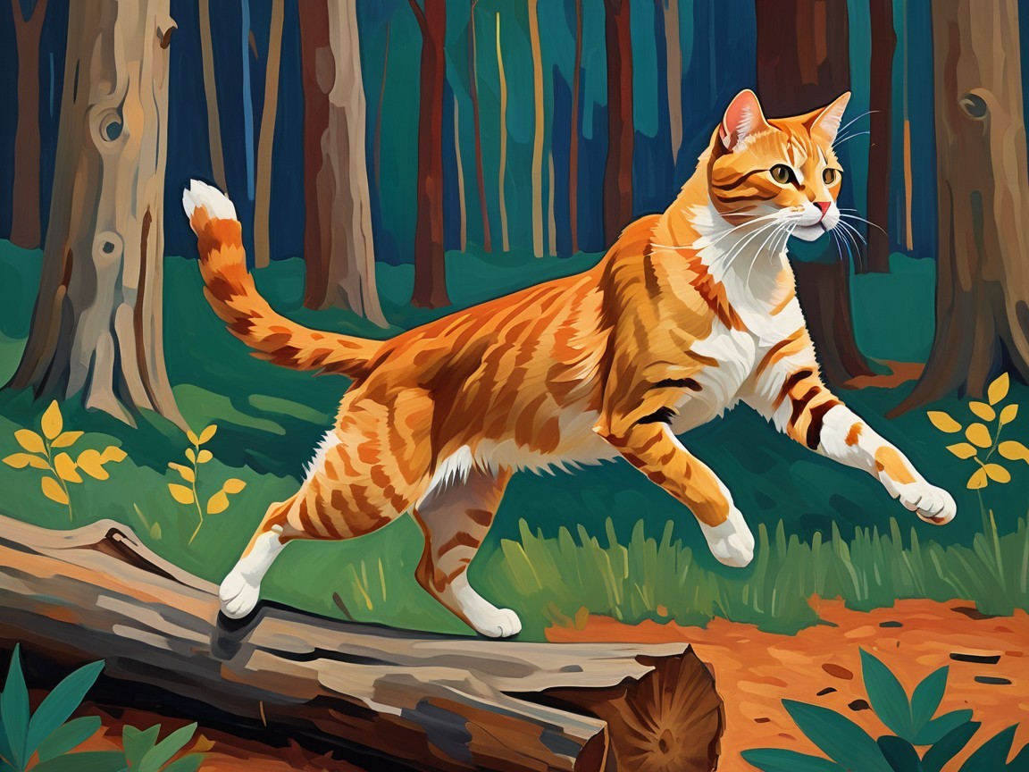 • Prompt: Create a digital painting depicting a three-legged cat running, in the style of Henri Matisse, Egon Schiele. Visible brush strokes. Moody but warm.