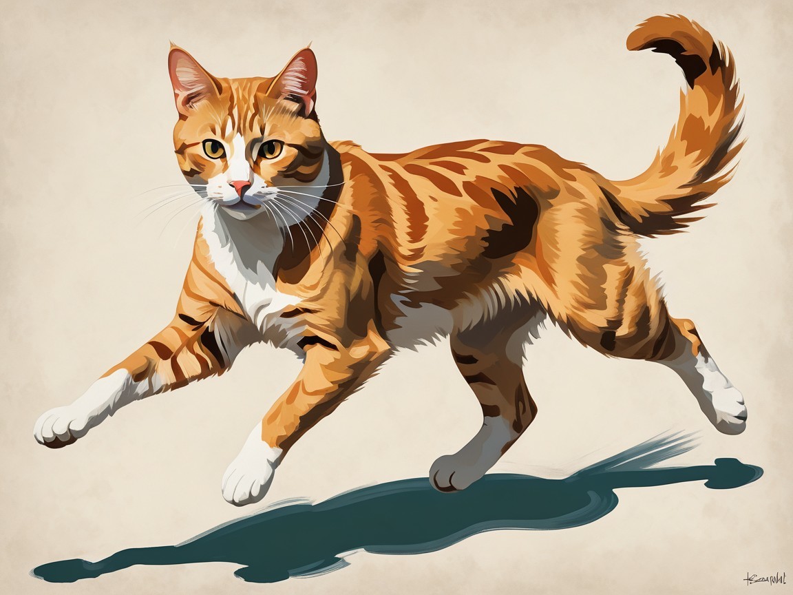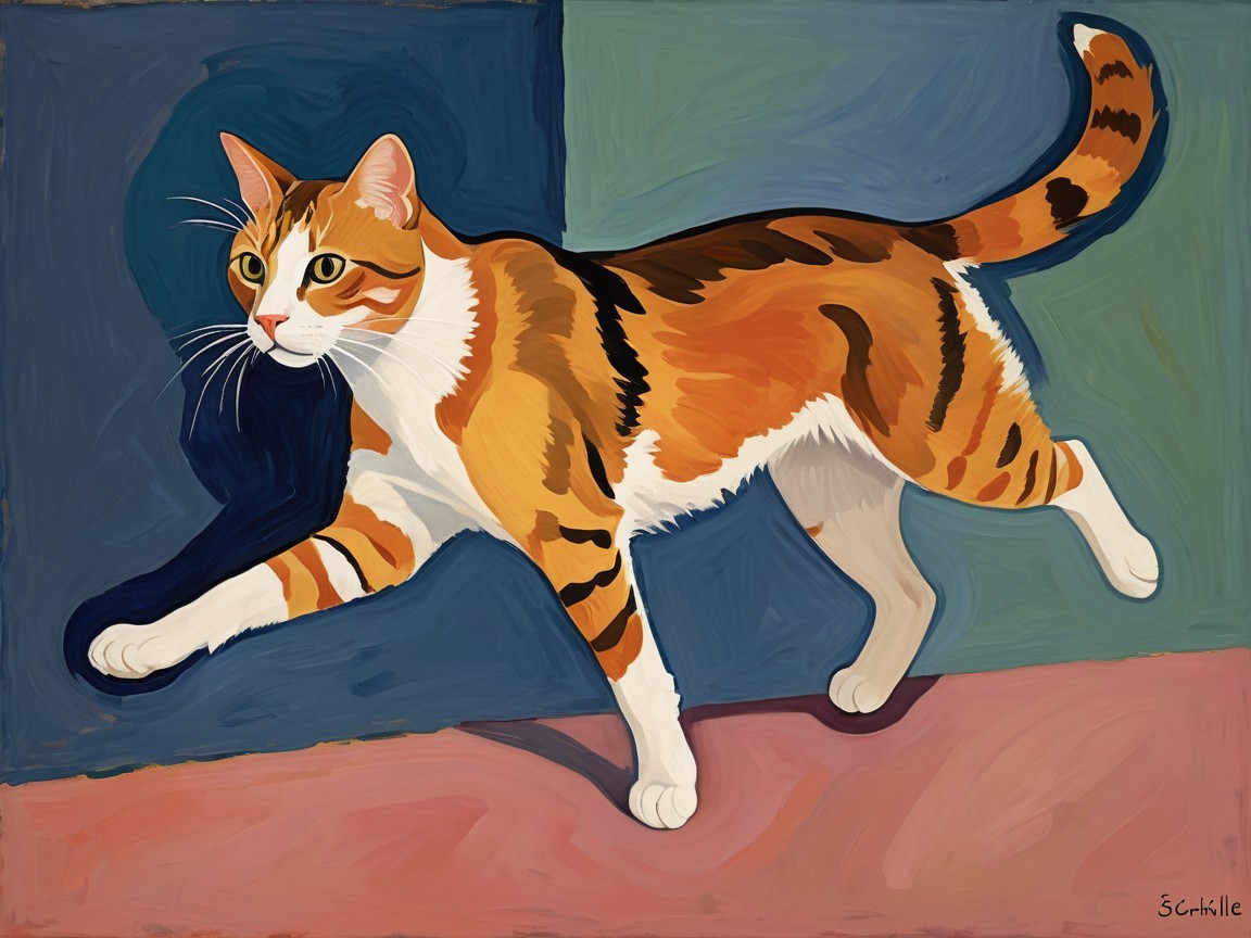 Prompt:  Create a digital painting depicting a three-legged cat running, in the style of Henri Matisse, Egon Schiele. Visible brush strokes. Moody but warm.