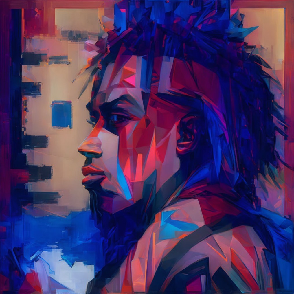 A faceted portrait glowing in reds, indigos, and teals — where urban culture meets luminous geometry. Bold colors, modern soul, and a prism of city light.