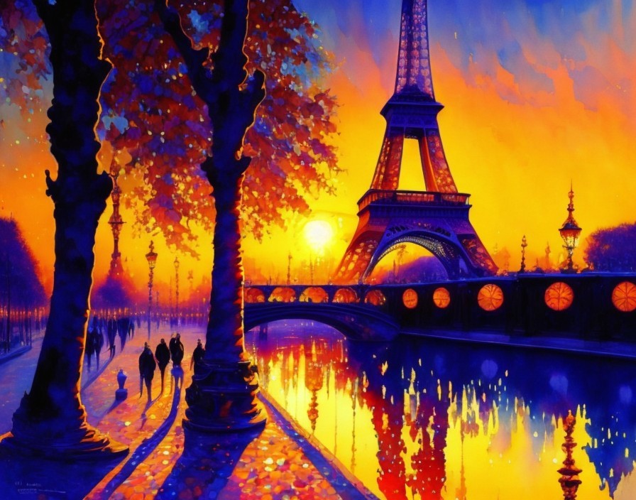Sunrise in Paris, France, no people, beautiful high definition, watercolor patchwork, satiny, high quality, shimmering elegant style with vibrant spectacular colors, elegant, highly detailed, glistening magic style, by Alphonse Mucha with elements of Tingatinga style and Gustav Klimt style