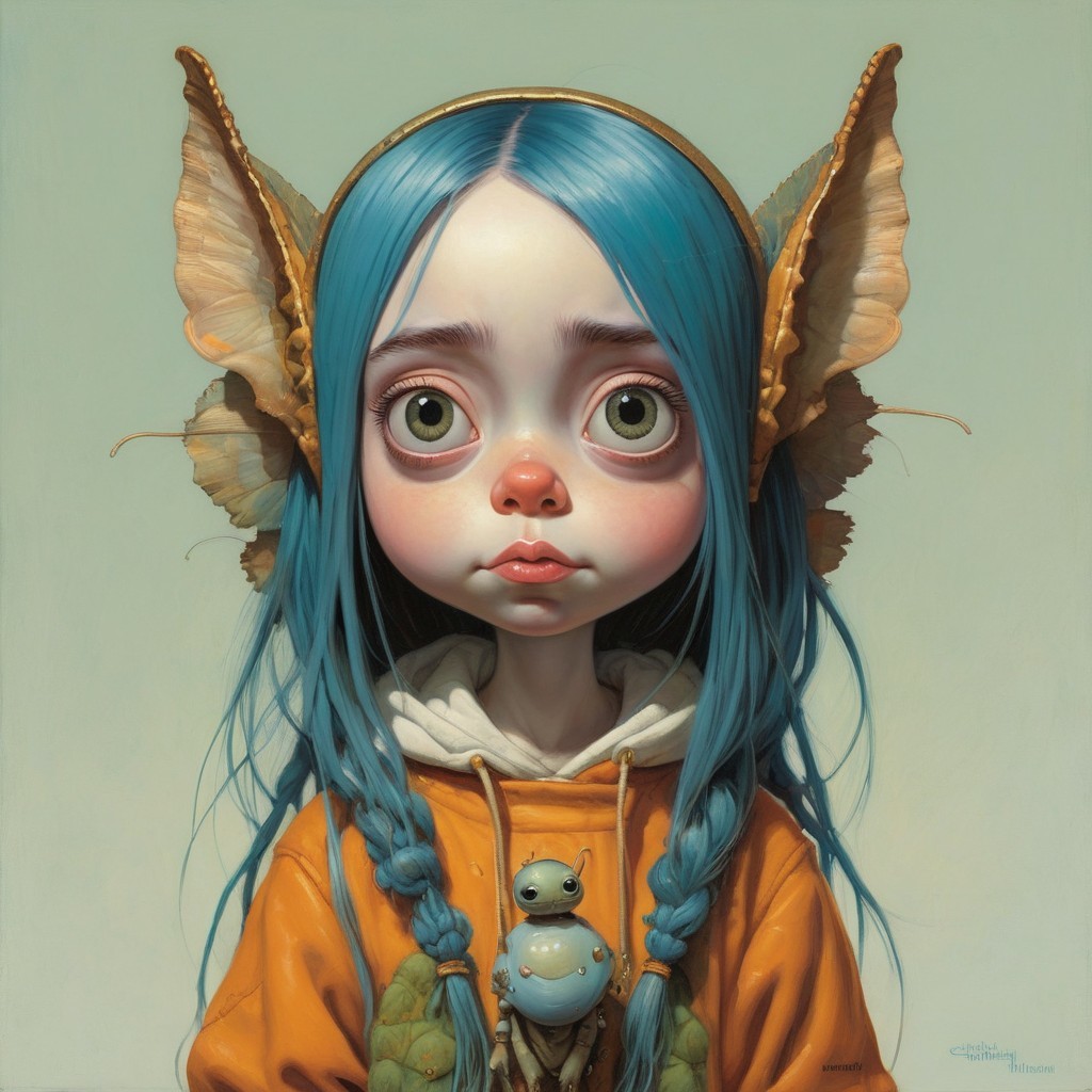 A whimsical illustration of a girl with large eyes, blue hair, elf ears, wearing headphones, and a hoodie with a bird pendant.