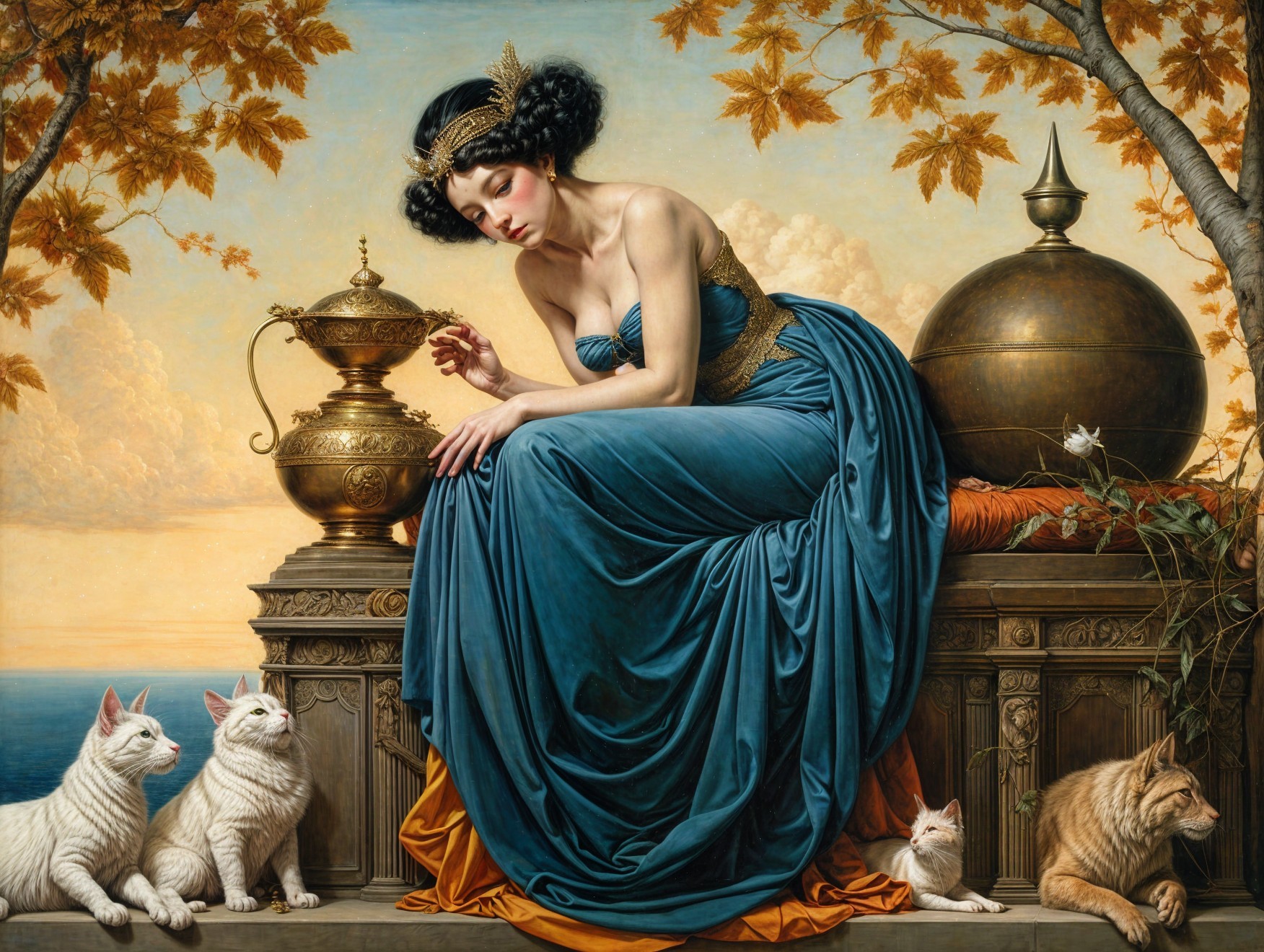 A majestic woman in a flowing blue gown, adorned with a crown and angelic wings, sits elegantly beside two dogs, surrounded by ornate vases and a serene seascape in the background.