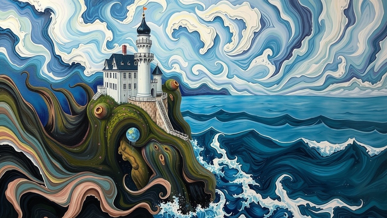Prompt: "Oil on canvas, swirling, surrealism, White castle on the cliff by the sea. By van gogh, windy weather, stormy clouds, dramatic, eerie, doomed"