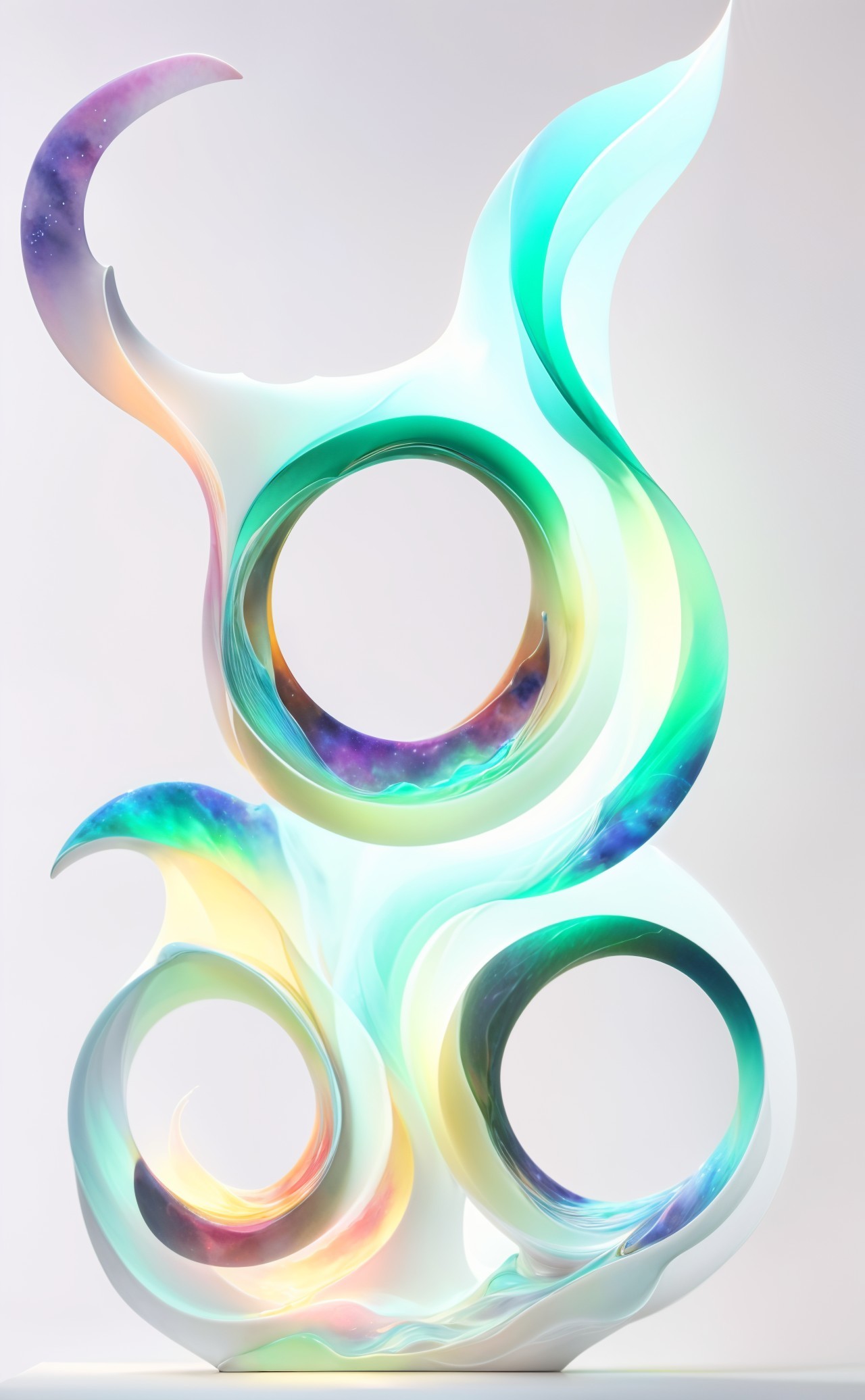 The image features an abstract sculpture with flowing, pastel-colored forms intertwining. Circular elements branch out, resembling waves of light and water, creating a calming, ethereal effect.