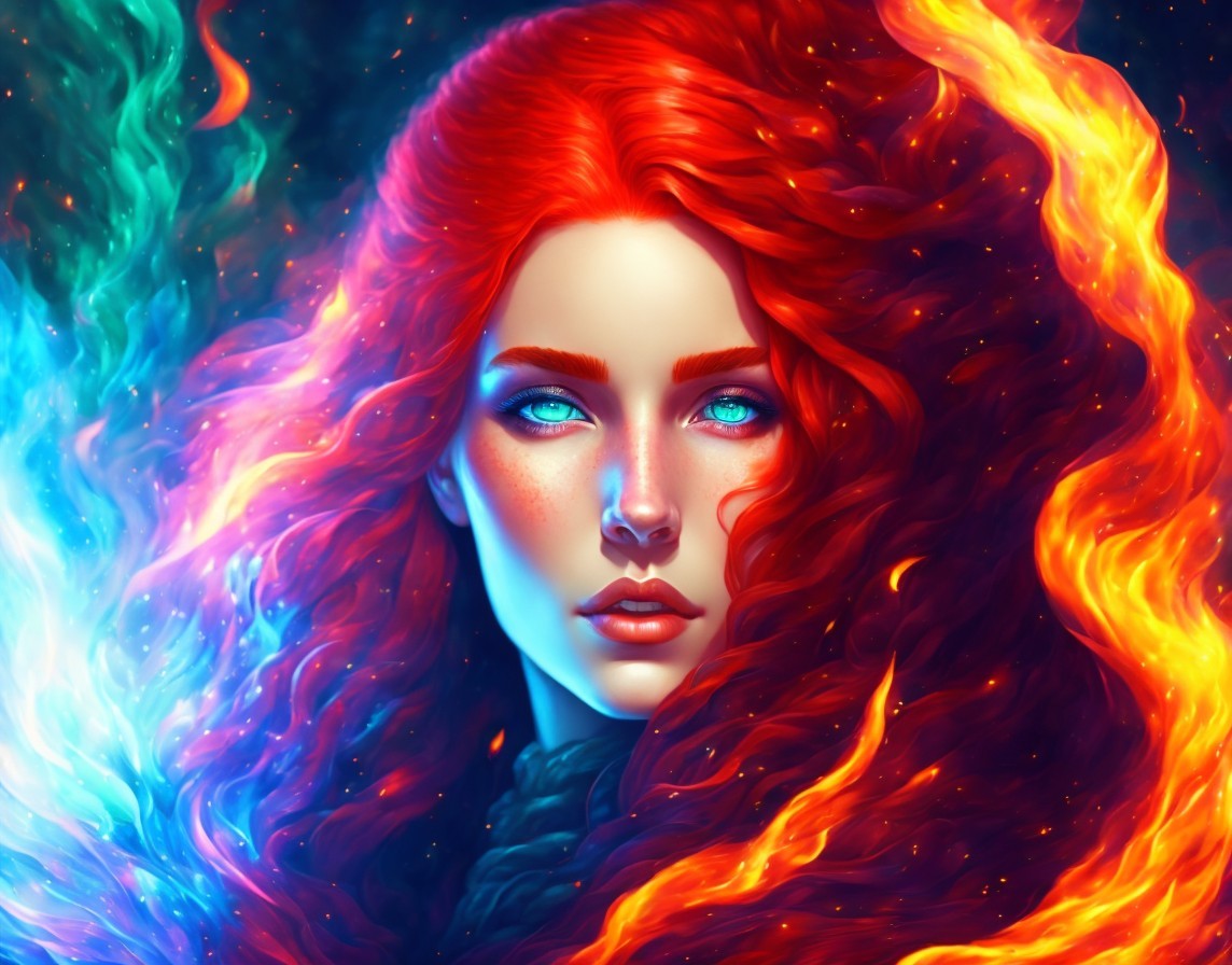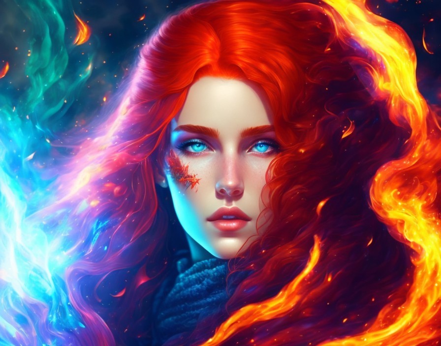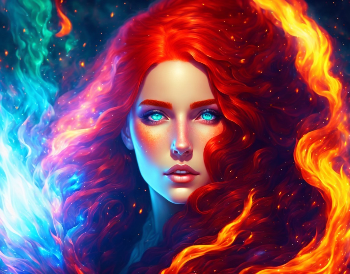Vibrant digital art portrait of a woman with fiery red hair and blue eyes