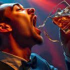 This photograph captures a dynamic, surreal moment of a young man drinking whiskey in a dimly lit, vibrant dance club. The man, who appears to be in his 40s with dark hair and a short beard, is wearing a light blue suit with a white shirt and a dark bow tie. His eyes are closed, and his mouth is wide open in an exaggerated, almost cartoonish fashion, as he tilts his head back to down the whiskey in one swift motion. The whiskey, which is amber-colored, is flowing from the glass into his mouth, creating a small, intricate river-like effect as it pours. Most of the whiskey spills out of his lips and down his jawline, frozen in a moment of time. The background is blurred with colorful lights, primarily red and blue, adding to the vibrant, energetic atmosphere of the dance club. The man's face is illuminated by the lights, highlighting his sharp features and the texture of his suit. The photograph uses a high-contrast style, with the clarity of the whiskey and the man's face sharply contrasting against the blurred background. The overall composition emphasizes the motion and intensity of the act, creating a dramatic and visually striking image.