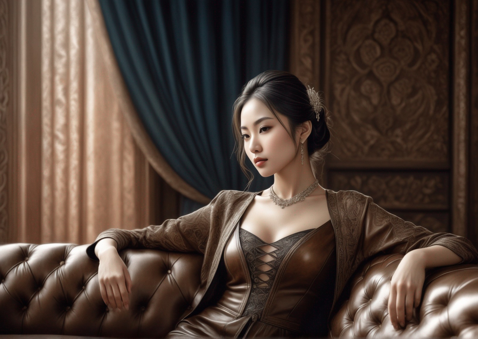 Elegant woman lounging on a leather couch in a luxurious room with dark drapery, wearing a brown outfit and a necklace.