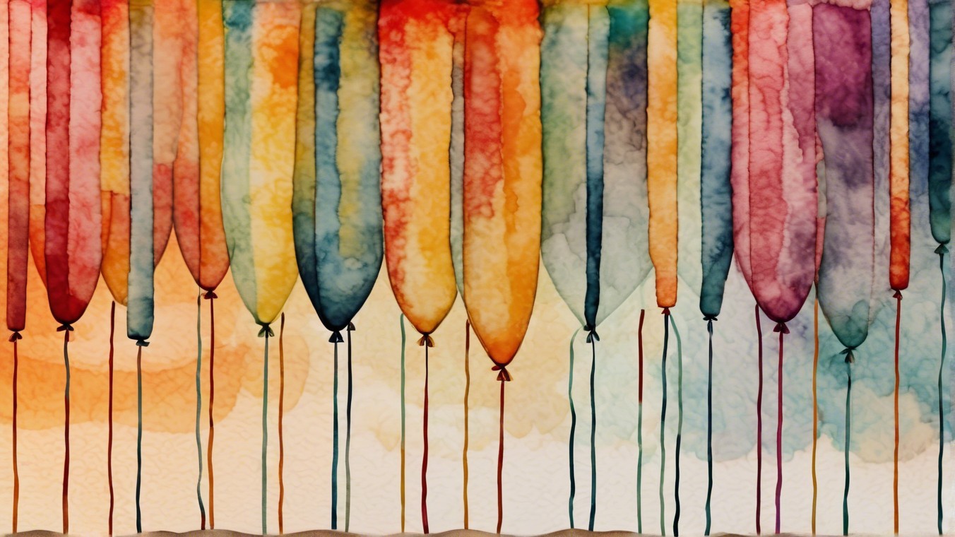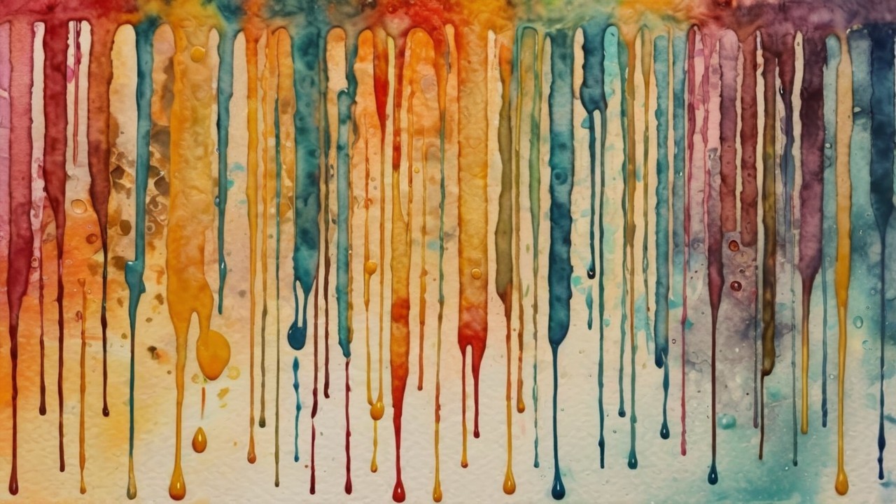 The image features an abstract composition with flowing drips in shades of blue and purple against a warm brown background, accented by white circles, creating a dynamic and fluid visual effect.