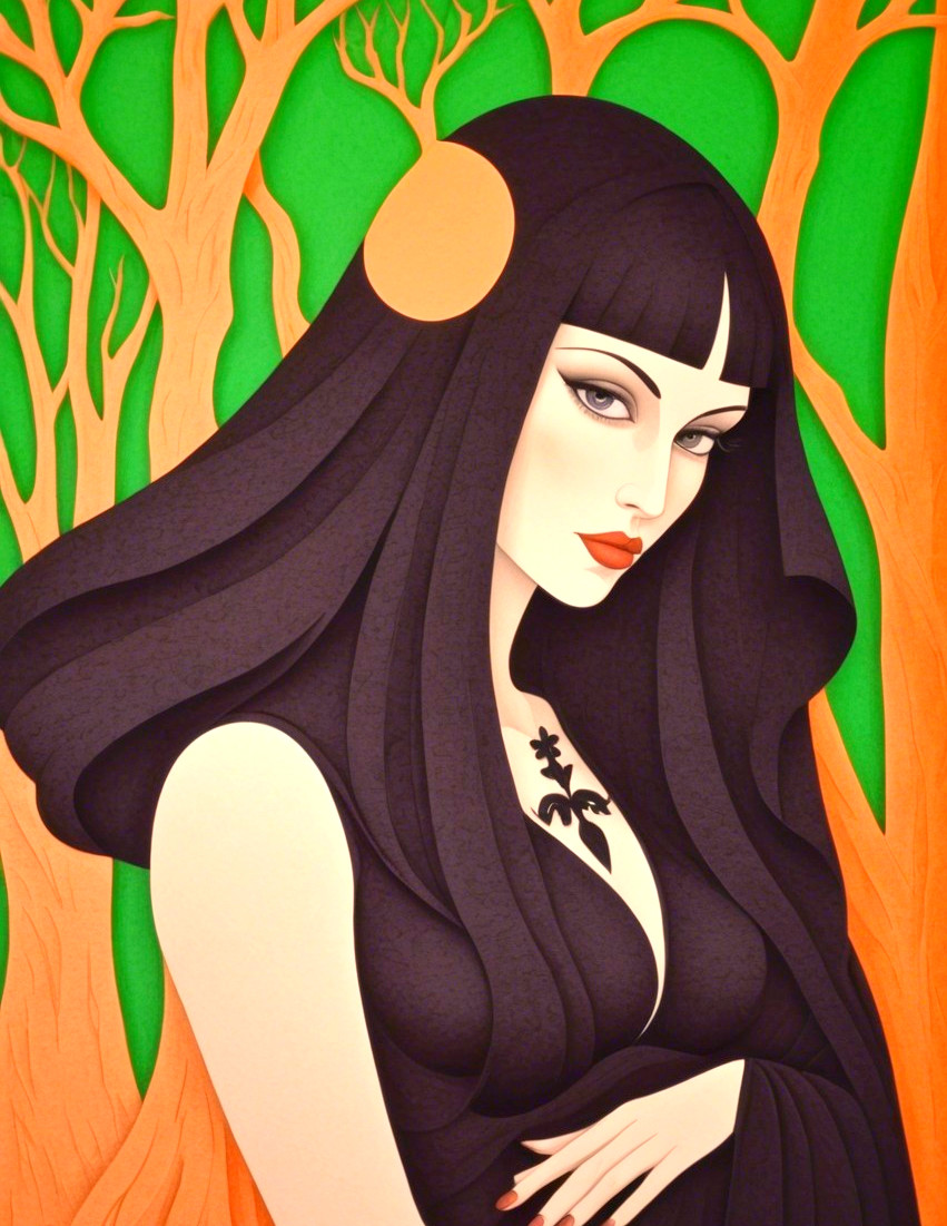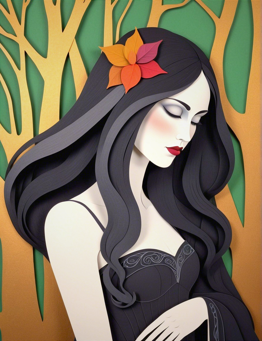 A woman with long, flowing black hair adorned with a vibrant autumn flower, set against a stylized backdrop of golden trees and rich green tones, exuding a serene and mysterious vibe.