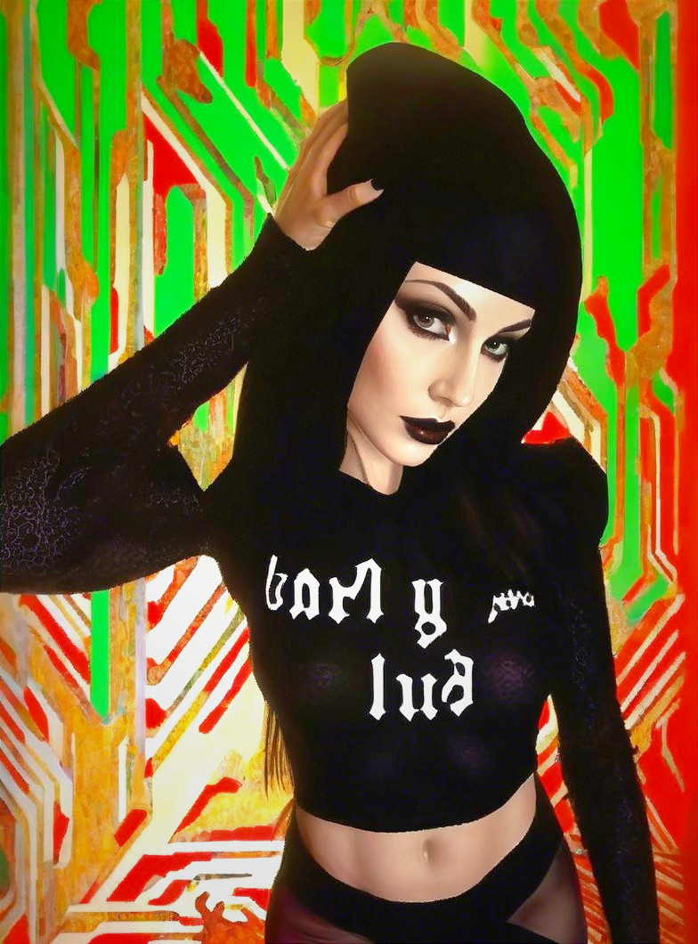 Create a neon-lit aesthetic with melting hues and peeling paint, influenced by pre-Raphaelite art. Opt for a triadic color scheme of yellow, green, and red, complemented by burnt orange and sepia tones. Emphasize detailed linework and rendering of auburn, sienna, and burnt orange shades for depth and scale. Implement 3D effects for luminosity.