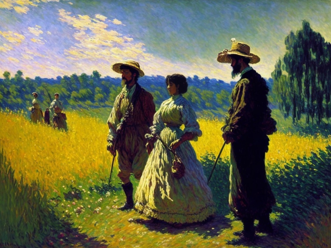 A vibrant landscape depicts two men and a woman in period attire walking through a sunlit field of yellow flowers, with distant figures strolling in a picturesque rural setting.