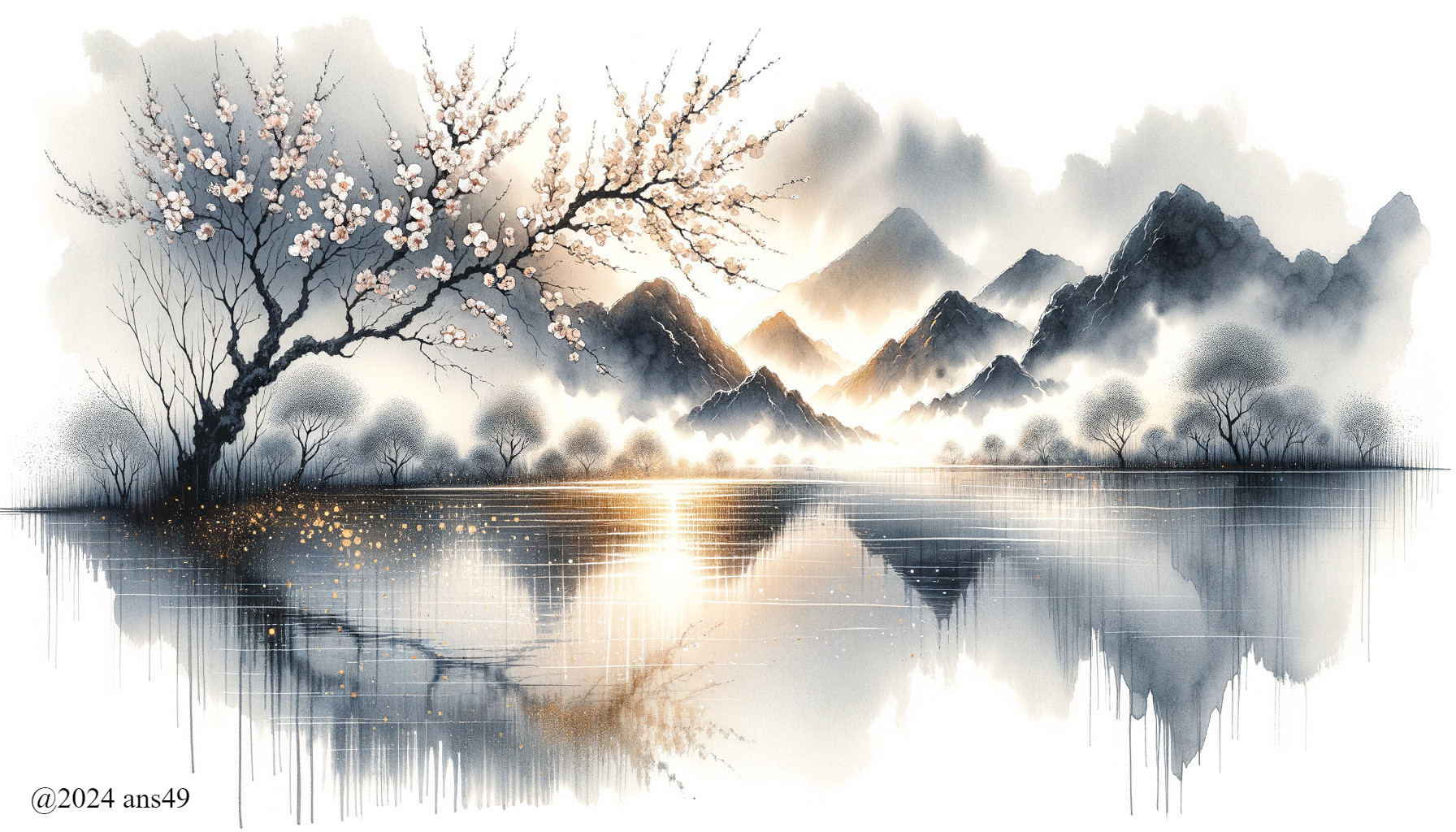 A tranquil ink-wash painting depicting a blossoming tree, misty mountains, and a serene reflective lake.