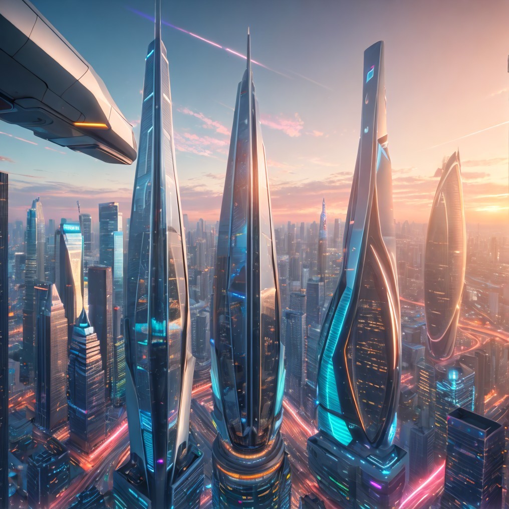 A futuristic cityscape at sunset with sleek, towering skyscrapers and a hovering vehicle.