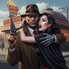 A futuristic scene features a cybernetic man in a trench coat holding a gun, embraced by a seductive vampire woman with a gothic style. They stand outside a retro diner, blending technology with dark allure.