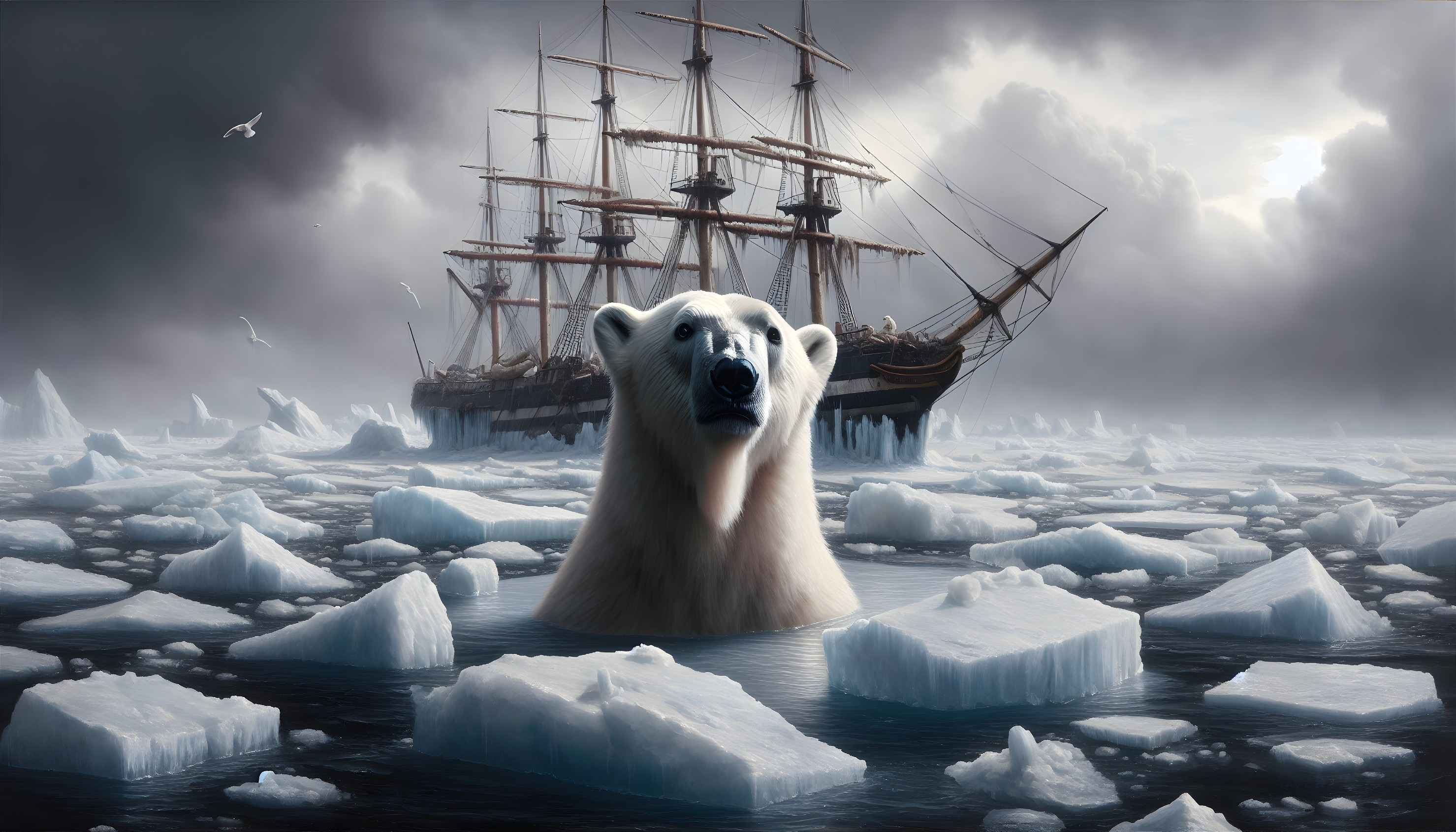 A lonely polar bear stands on a floating ice sheet, amidst the frigid blue waters of the North Pole. In the background is a classic sailing ship, once frozen in time, it is now free to roam as a ghost ship among the last remnants of ice. The future for both is bleak because they have reached the point of no return....