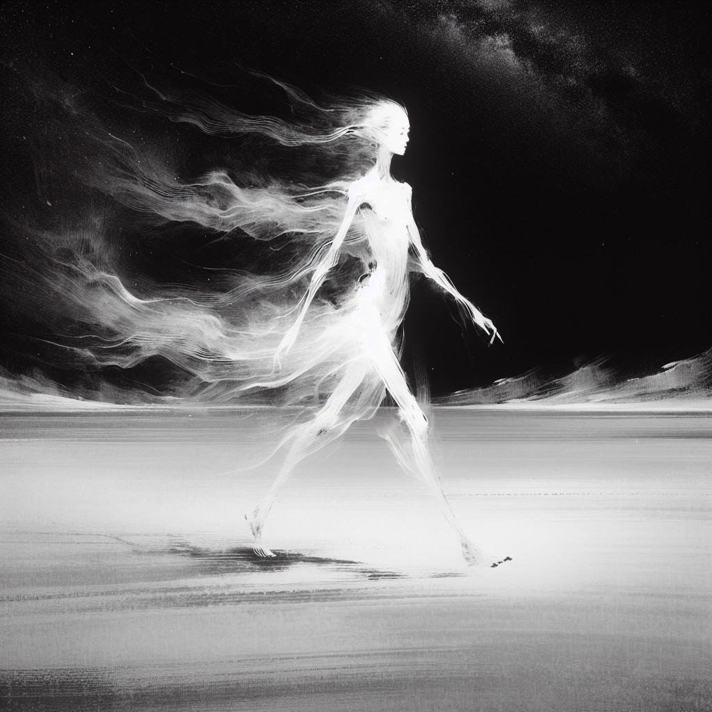 Prompt: "Ghostly thin lilliputian figure with ethereal wispy body dissolving behind as she walks towards the viewer, milky translucent skin, thin arms and legs, vast open night sky, traditional Chinese ink painting style, emotional depth, sense of isolation, minimalistic white background, evocative brushstrokes, atmospheric perspective, serene and melancholic ambiance, dark void background, deep artistic concept, blurred depth of field, contemplative mood"