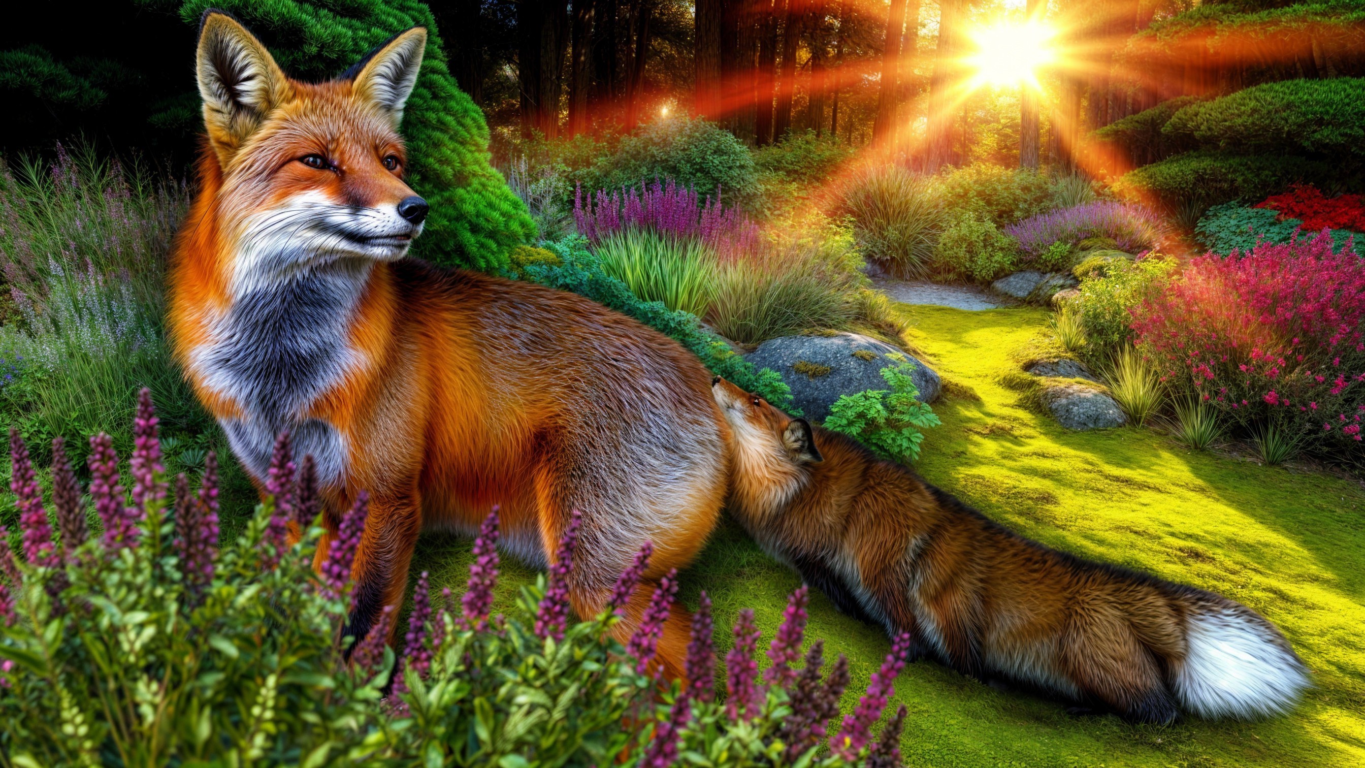 A vibrant scene depicts a majestic fox in a lush garden, surrounded by colorful flowers and greenery, with the warm rays of the sun shining through the trees.
