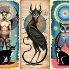 Create a vibrant and colorful digital artwork featuring three distinct figures, each resembling vintage Asian-inspired posters. 1. **Left Figure**: A stylized, female character with an hourglass body shape. She has pale skin and long, platinum blonde hair styled in a retro fashion, framed by a radiant yellow halo. She’s wearing a black bikini, striking a confident pose with her arms extended. She has bee wings on her back. The background is a soft pink, accentuating her curves. 2. **Center Figure**: A fantastical humanoid creature with a muscular build, covered in intricate, concentric circle patterns in various vibrant colors. The figure is dressed in bird clothing, feathered and has a beak with exaggerated facial bird features. Its hands are clawed, and it has a long, serpentine tail that wraps around its legs. Beside it sits a sleek black cat with striking yellow eyes. The background is a bright turquoise, emphasizing the vivid colors of the body art. 3. **Right Figure**: An elegant male character wearing a flowing dark robe with intricate patterns and a contrasting sash. This figure has a blue-skinned complexion, sharp facial features, and elongated ears with hair styled in an elaborate top knot. He is raising one hand in a welcoming gesture. The background is a rich golden yellow, providing a warm contrast to his attire. The overall composition is balanced, showcasing each figure with a unique color palette and style, drawing influences from traditional Asian art and modern graphic design. Modifiers: acrylic art pencil sketch collage Hieronymus Bosch roy lichtenstein etching pop-art Banksy Mark Ryden Keith Haring plakat charcoal drawing Catrin Welz-Stein Victor Brauner Hans Bellmer Kintsugi Moebius (Jean Giraud) Cy Twombly Divisionism Blueprint Aesthetics James Ensor retro-psychedelic Elements of kintsugi, gold and oxidized copper patina. multi-color woodblock print aged paper texture atom punk Crepax comic art ligne claire illustrazione botanica. clovis trouille psychedelic lettering Zen- Painting Industrial Blueprint.