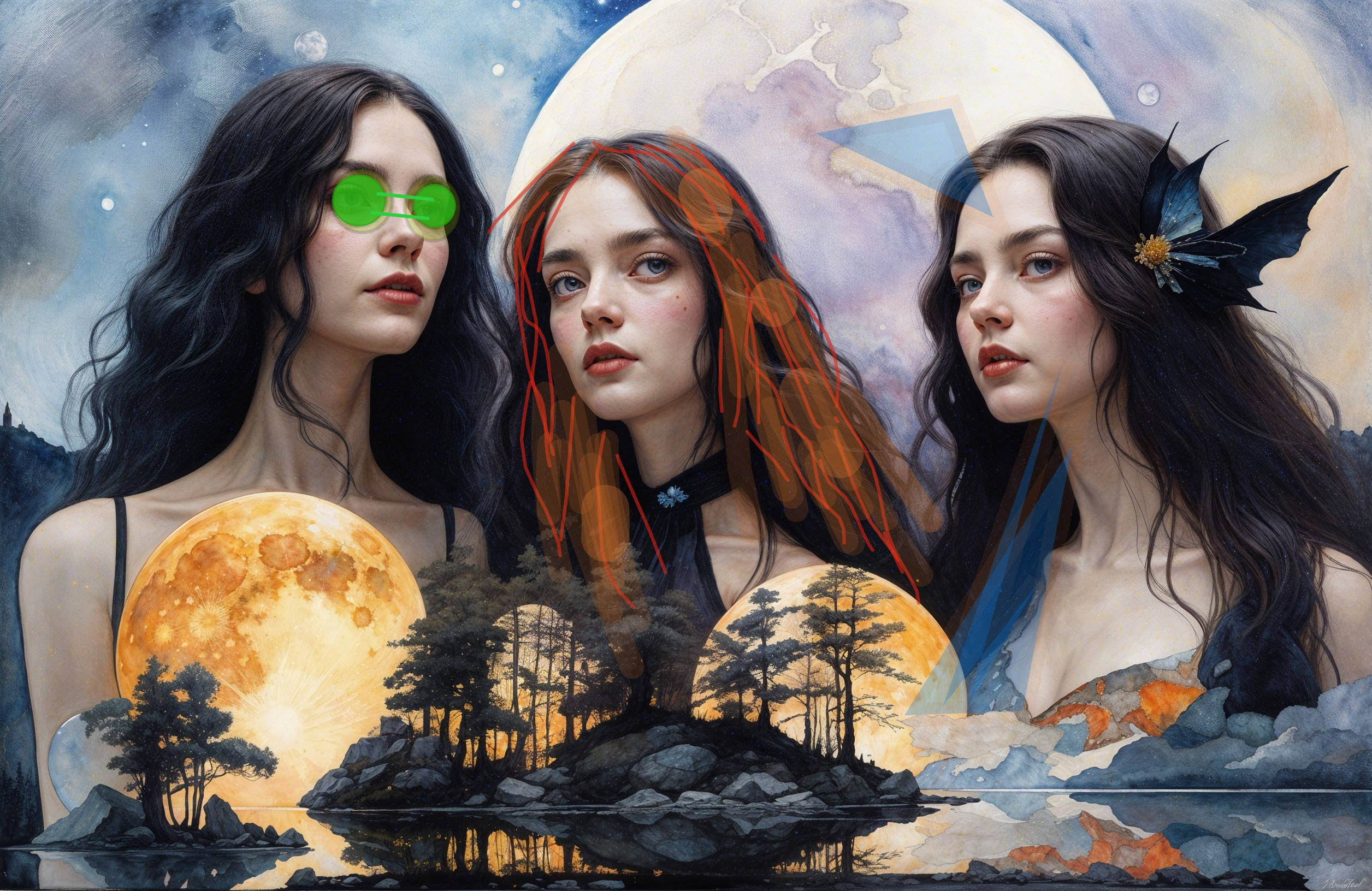 Three ethereal women with distinct hair colors gaze moodily, surrounded by glowing moons and a serene landscape, featuring a house on an island beneath a starry sky. Mystical and enchanting.