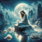 A serene figure sits gracefully on a rock in a tranquil lake, surrounded by glowing water lilies. The moonlight bathes the scene in ethereal beauty, enhancing the mystical atmosphere.