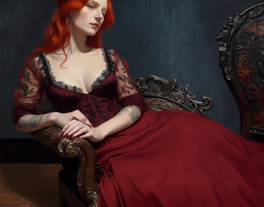 A red haired Victorian lady on a chaise but she is in a long large gown and has tattoos