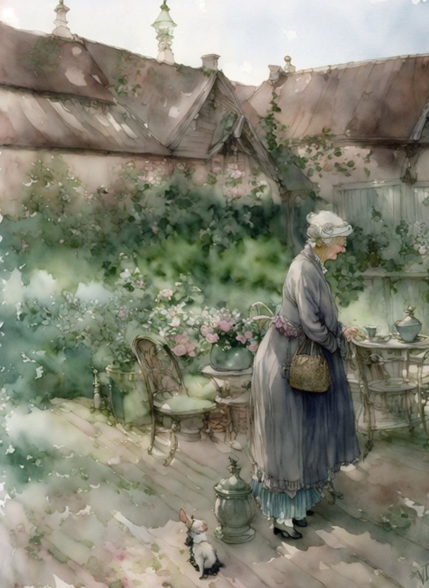A charming elderly woman in a green dress stands in a lush greenhouse, holding a basket. Surrounded by vibrant plants and soft morning light, she exudes warmth and a love for gardening.