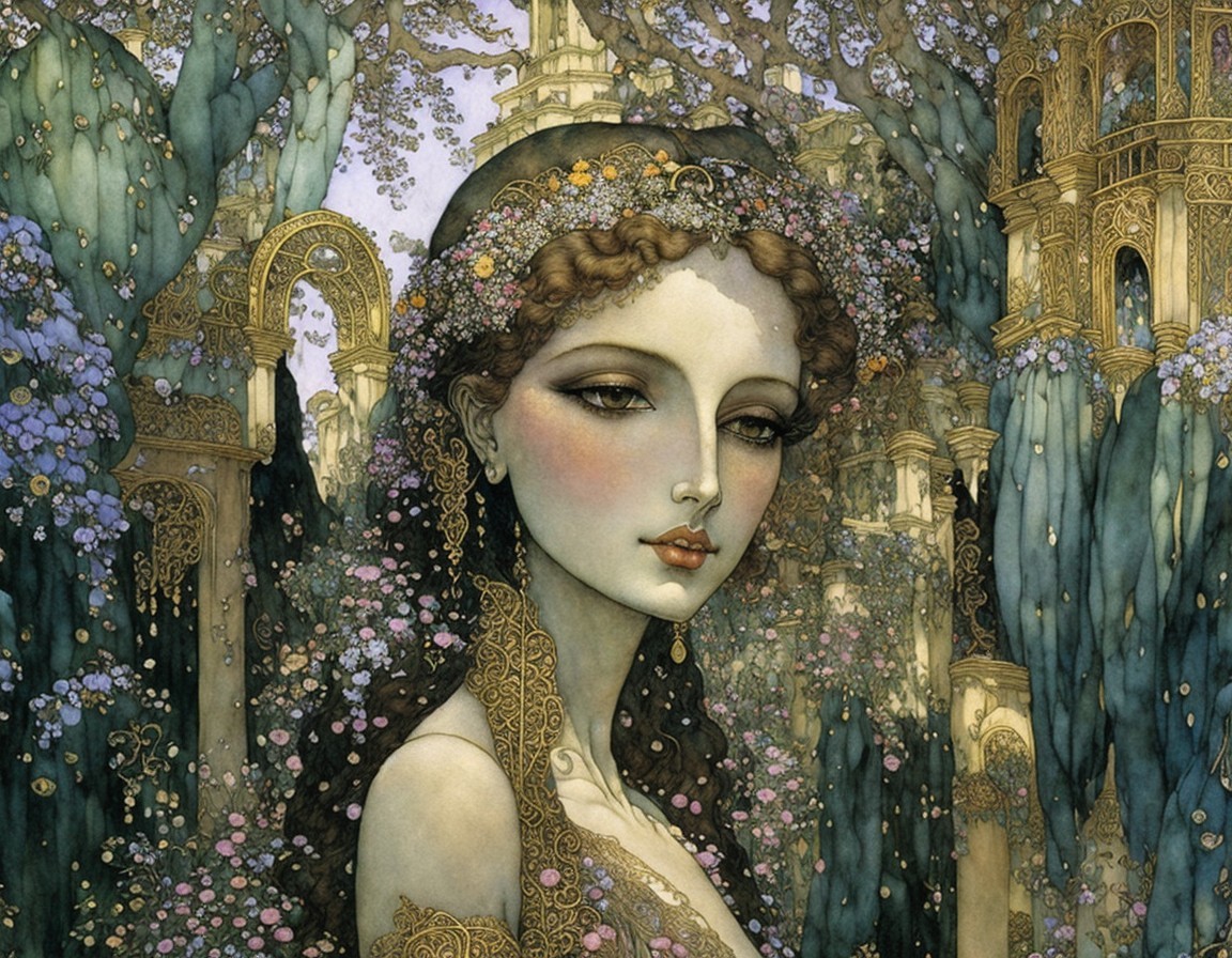 An illustration of a woman with long wavy hair, adorned with flowers and elegant jewelry, surrounded by green foliage.