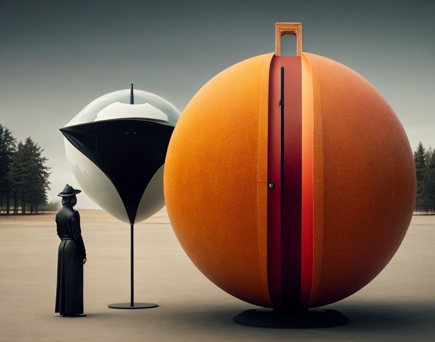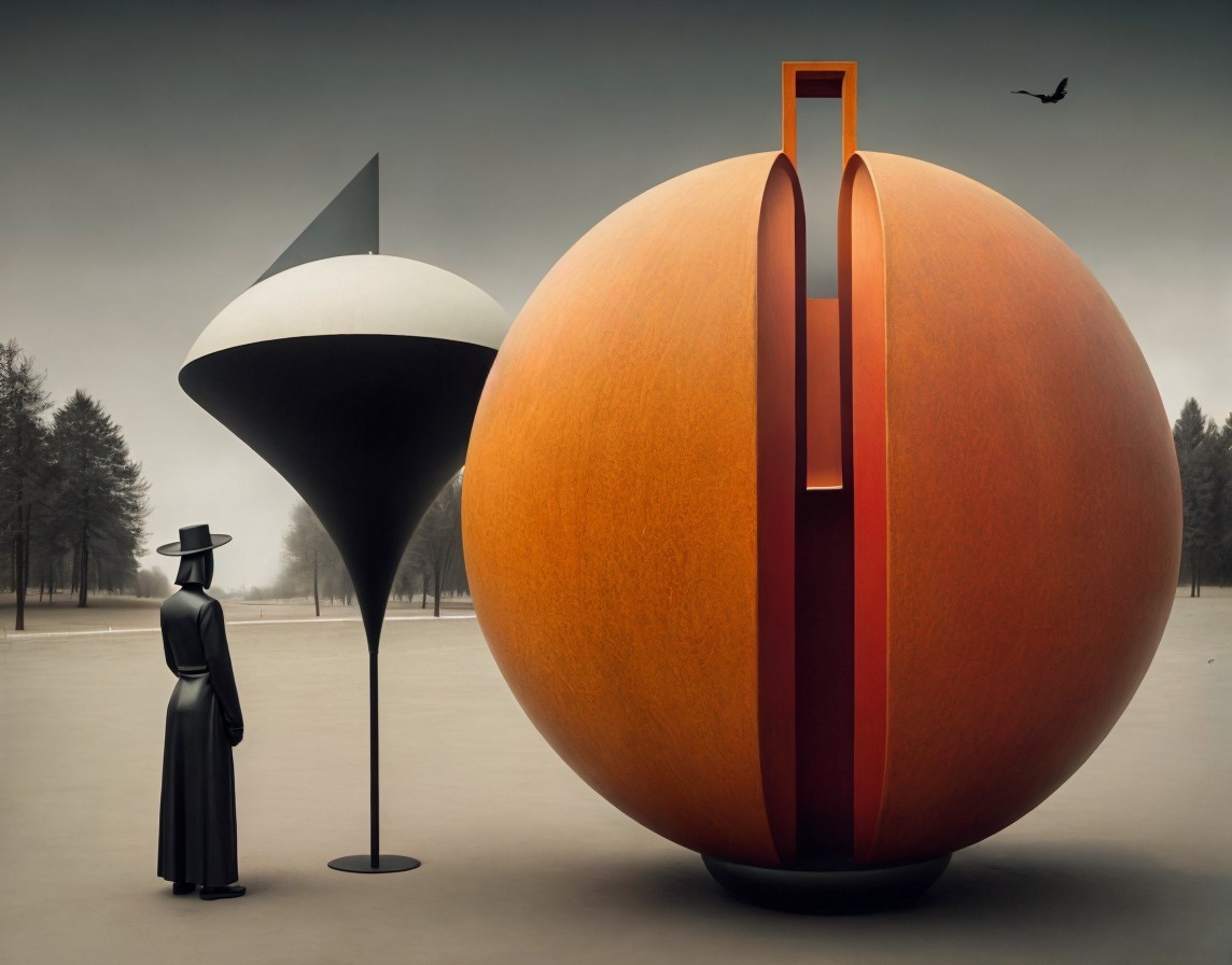 A surreal image featuring a person observing giant, orb-shaped structures with architectural details, set in a desolate landscape.
