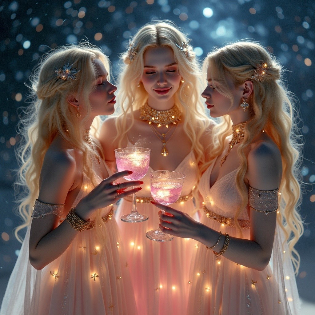 Three ethereal figures with long, flowing blonde hair stand together in soft, shimmering dresses. They each hold glowing cocktails, surrounded by fairy lights and a magical, wintry backdrop.