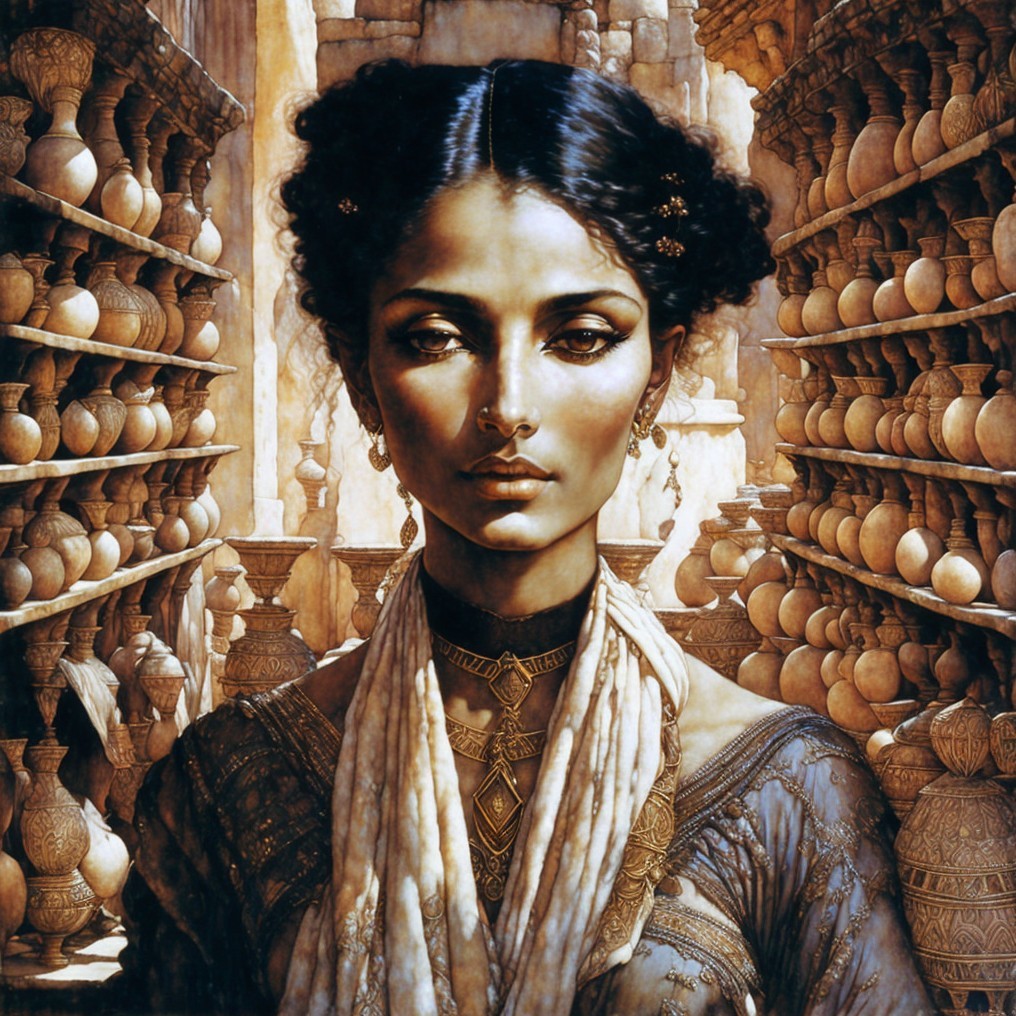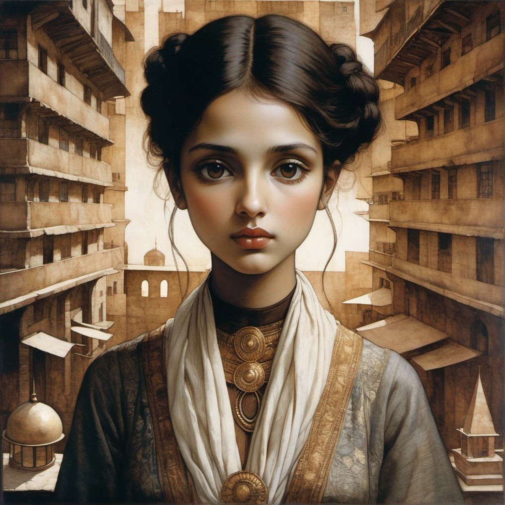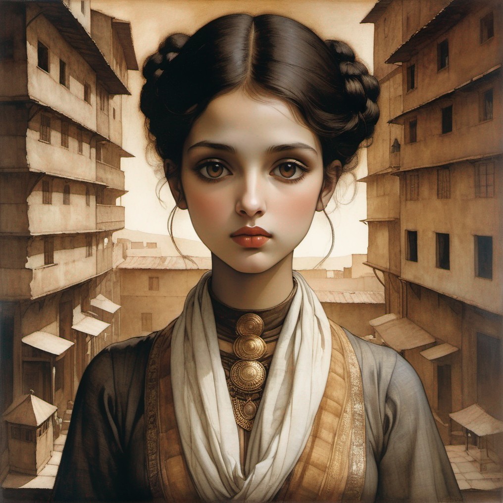 A portrait of a young woman with dark hair in braided updo, wearing earrings and a necklace, against an old-time street backdrop.